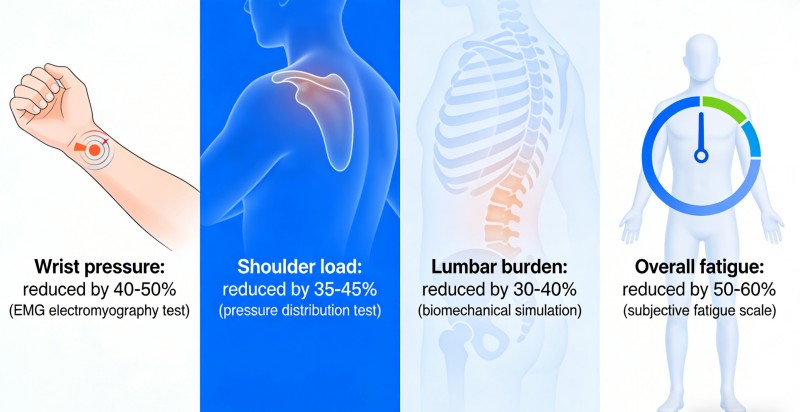 Csökkentett terhelési kockázat Csuklónyomás: 40-50%-kal csökkentve (EMG elektromiográfiás vizsgálat) Vállterhelés: 35-45%-kal csökkentve (nyomáseloszlási vizsgálat) A hát alsó részének terhelése: 30-40%-kal csökkentve (biomechanikai szimuláció) Általános fáradtság: 50-60%-kal csökkent (szubjektív fáradtsági skála)