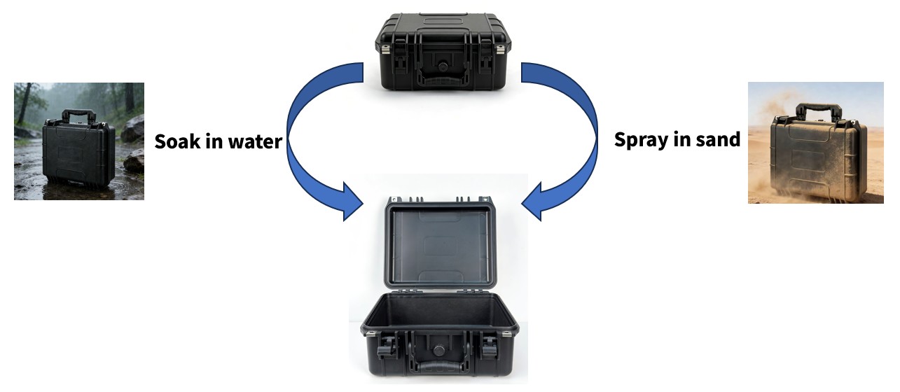 Teljesen zárt védelmi rendszer Fő tömítőcsík: Folyamatos, egy darabból öntött szilikon szalag, varratmentes kialakítás Kiegészítő tömítés: Másodlagos tömítőajak a fedél szélén Retesz tömítése: Víz- és porálló kialakítás a retesznél Zsanérvédelem: Tömítő kezelés a zsanértengely végén Szerkezeti szilárdság tervezése Egyenletes falvastagság, megerősített kulcsterületek Négy sarkos ütközésgátló szerkezet a fokozott ütésállóság érdekében Többször is leesett 1,2 méter magasból Környezeti alkalmazkodóképesség: széles hőmérséklet-tartományban alkalmazkodó képesség (-30 ℃ és +80 ℃ között); UV-öregedésálló kezelés; Sópermet korrózióálló (tengeri környezetre alkalmas); Penészgomba és antibakteriális kezelés (opcionális)