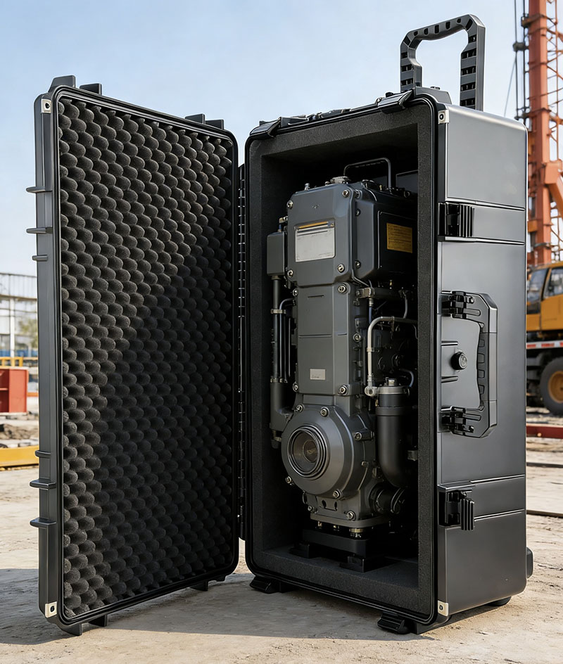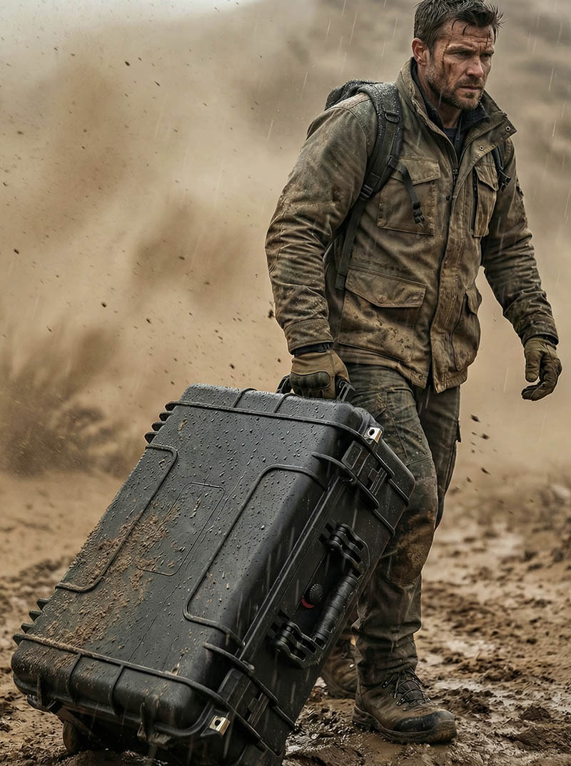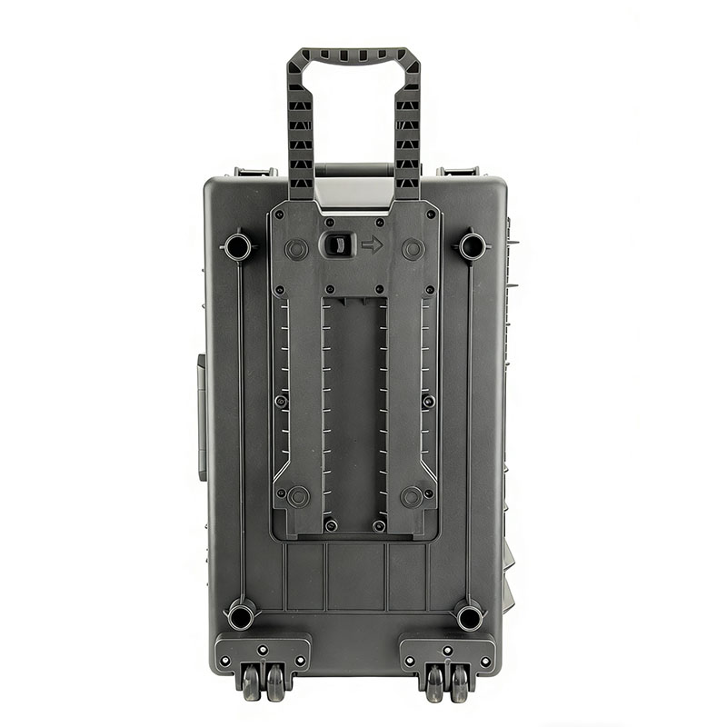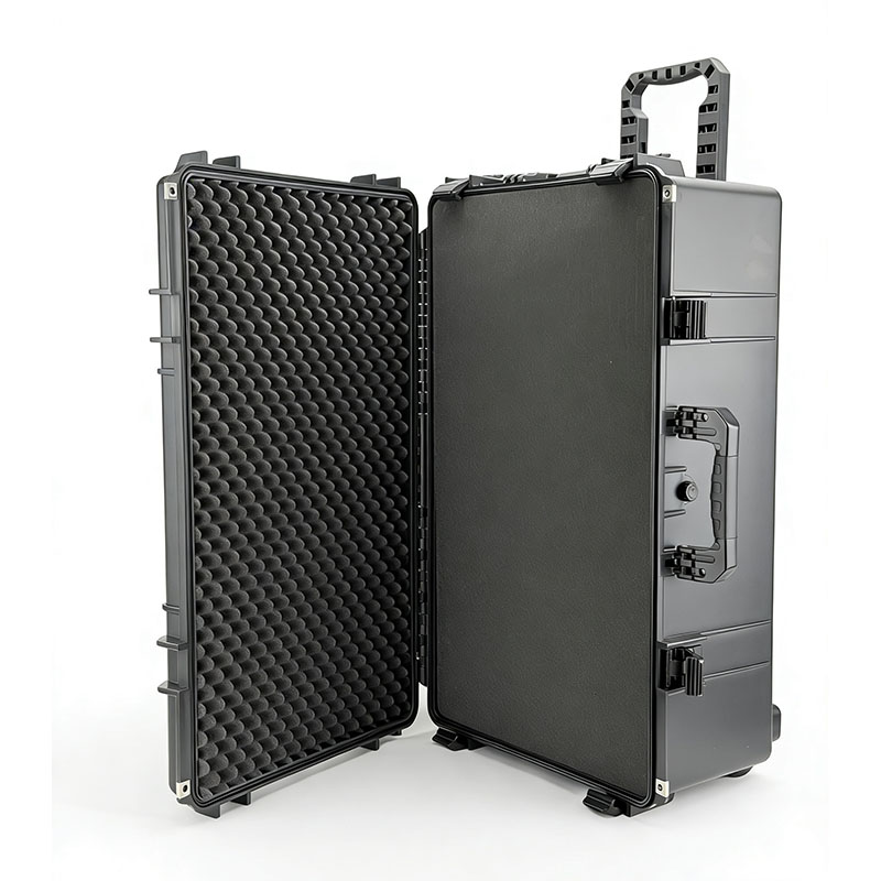 Ipari minőségű mobilitási és manőverező rendszer: Egy ilyen nagy teherbírású védőtok mozgatásához valódi ipari tervezésre van szükség. Behúzható vonórúd-rendszerrel láttuk el a stabilabb tapadás érdekében; négy nagy átmérőjű, csapágyazott kerék, amelyek a húzórúd alatt vannak elhelyezve, biztosítják a biztonságot lejtőn vagy járműben álló helyzetben. Ez a rendszer lehetővé teszi, hogy egyetlen személy könnyedén manőverezzen közel 100 kg-os terhet, és olyan fürgén mozgassa, mint egy normál bőrönd sík talajon.
